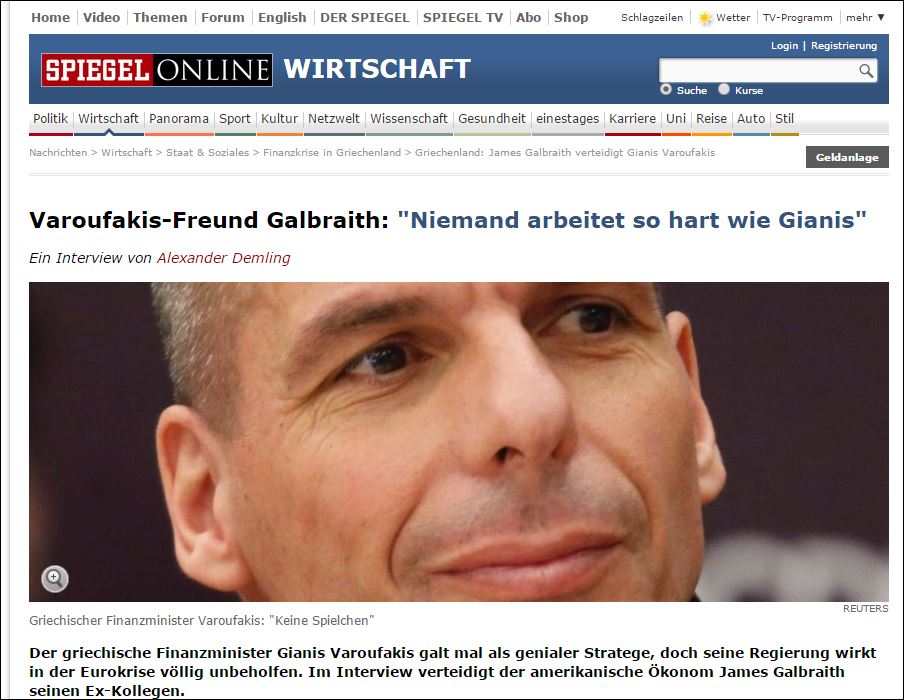 Με συνέντευξη του στο περιοδίκο Spiegel, ο Γκάλμπρεϊθ δεν δίστασε να υπερασπιστεί τον κ. Βαρουφάκη, ακόμα και σε προσωπικό επίπεδο.