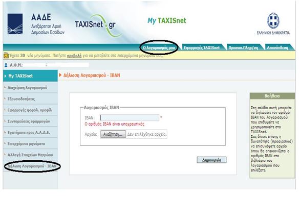- Με τους κωδικούς TAXISnet, από το δικτυακό τόπο της Α.Α.Δ.Ε. (www.aade.gr), εισέρχεστε στην εφαρμογή της Προσωποποιημένης Πληροφόρησης και μεταβαίνετε στην καρτέλα «Ο λογαριασμός μου». Εκεί, στο μενού που υπάρχει αριστερά, επιλέγετε «Δήλωση Λογαριασμού – IBAN» όπου στο αντίστοιχο πεδίο καταχωρείτε τον IBAN του λογαριασμού που επιθυμείτε σε μορφή GRxxxxxxxxxxxxxxxxxxxxxxxxx.