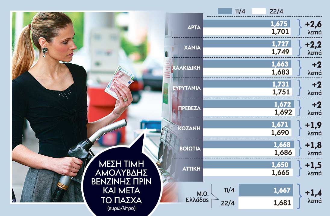 Έτσι, οι μεγαλύτερες ανατιμήσεις για την περίοδο 11 με 22 Απριλίου καταγράφηκαν στην Άρτα (2,6 λεπτά το λίτρο), Χανιά (2,2 λεπτά το λίτρο), Χαλκιδική, Ευρυτανία και Πρέβεζα (2 λεπτά το λίτρο), Κοζάνη (1,9 λεπτά το λίτρο), Βοιωτία (1,8 λεπτά το λίτρο) αλλά και στην Αττική η αύξηση ήταν της τάξης του 1,5 λεπτού το λίτρο, πάντα σε μέσα επίπεδα. Αυτό σημαίνει ότι υπήρχαν στα πρατήρια των περιοχών μεγαλύτερες αλλά και μικρότερες αυξήσεις.