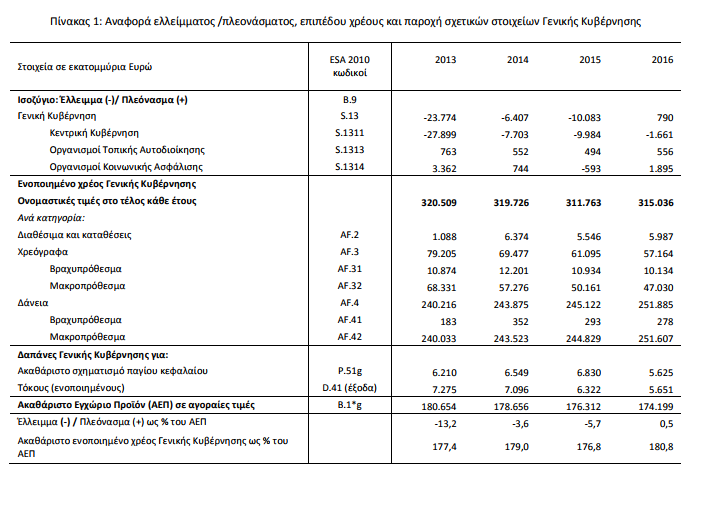Το πλεόνασμα της Γενικής Κυβέρνησης για το έτος 2016, σύμφωνα με το ESA 2010, εκτιμάται στα 0,8 δισ. ευρώ (0,5% επί του Ακαθάριστου Εγχώριου Προϊόντος), ενώ το ακαθάριστο ενοποιημένο χρέος της Γενικής Κυβέρνησης σε ονομαστικές τιμές στο τέλος του 2016 εκτιμάται στα 315,0 δισ. ευρώ, (180,8% επί του Ακαθάριστου Εγχώριου Προϊόντος).