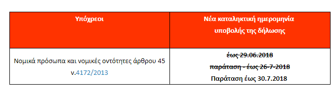 2. Παρατείνεται μέχρι και την 30η Οκτωβρίου 2018 η προθεσμία υποβολής των δηλώσεων φορολογίας εισοδήματος φορολογικού έτους 2017 νομικών προσώπων και νομικών οντοτήτων του άρθρου 45 του ν.4172/2013 αρμοδιότητας των Δ.Ο.Υ. Παλλήνης και Δ.Ο.Υ. Ελευσίνας.