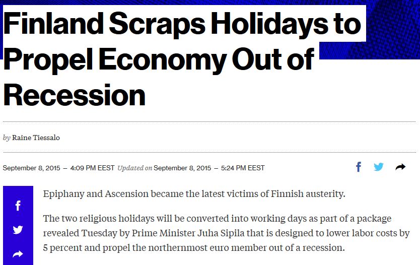 Η κυβέρνηση της Φινλανδίας, της σκληρής στάσης έναντι της Ελλάδας, κόβει εθνικές αργίες και ετήσιες άδειες για να ενισχύσει το ΑΕΠ που πέφτει σε ύφεση.