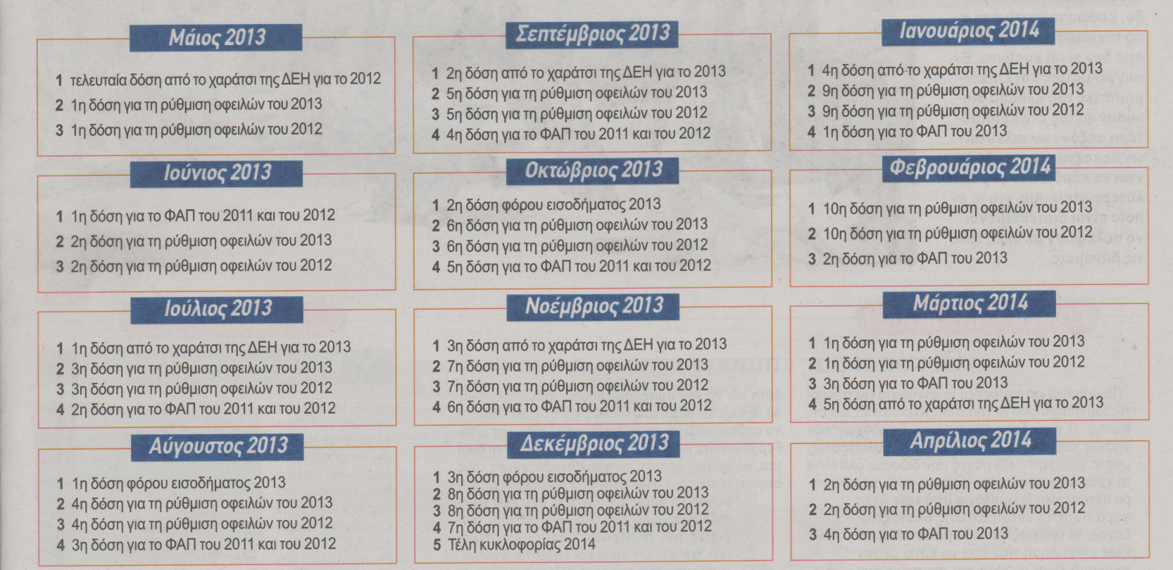 Όσοι χρωστάνε φόρους του 2012 και έχουν σκοπό να είναι συνεπείς στις υποχρεώσεις τους και να πληρώσουν τους φετινούς, θα πρέπει να επισκεφτούν 45 φορές το ταμείο της εφορίας μέσα στο επομένο δωδεκάμηνο.
