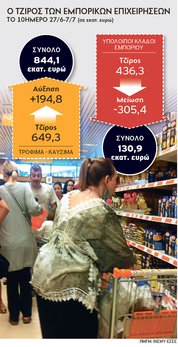 Στον αντίποδα αύξηση 30% σημειώθηκε στη ζήτηση των τροφίμων και καυσίμων, που σε απόλυτα μεγέθη μεταφράζεται σε επιπλέον 194,8 εκατ. ευρώ. Αξίζει να σημειωθεί ότι οι πωλήσεις στα τρόφιμα και καύσιμα σε ένα φυσιολογικό δεκαήμερο κυμαίνονται στα 649,3 εκατ. ευρώ. Η πανικόβλητη εφόρμηση των νοικοκυριών στα σούπερ μάρκετ και τα βενζινάδικα εκτίναξε τον κύκλο εργασιών στα 844,1 εκατ. ευρώ.