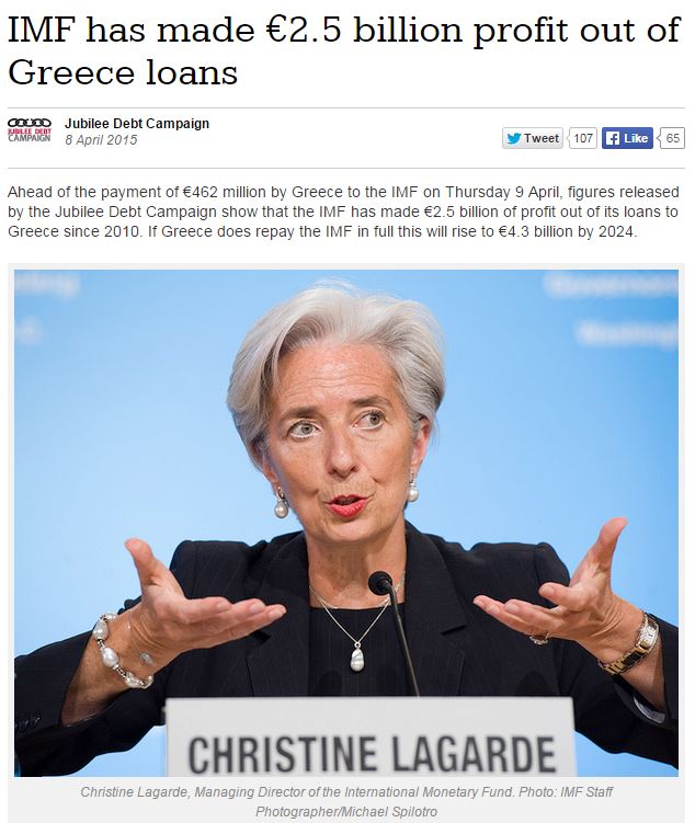 Ειδικότερα, σύμφωνα με στοιχεία της βρετανικής μη κυβερνητικής οργάνωσης Jubilee Debt Campaign, το ΔΝΤ έχει αποκομίσει κέρδη 2,5 δισ. από τα δάνεια που χορηγήθηκαν στην Ελλάδα από το 2010 έως το 2014.