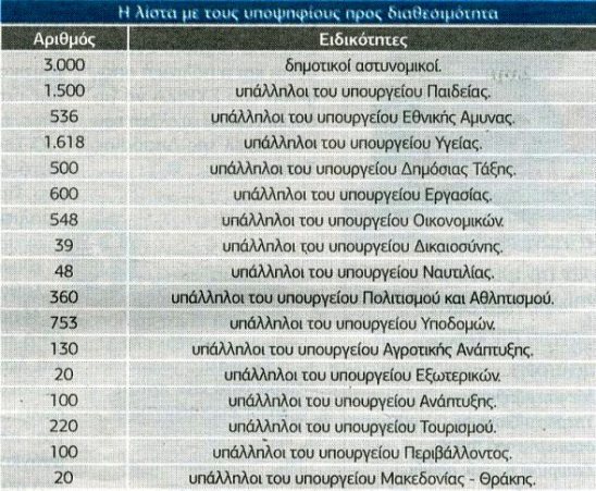 Πιο συγκεκριμένα, ποσοστό 36% τοποθετήθηκε σε υπηρεσίες του υπουργείου Προστασίας του Πολίτη (αστυνομικά τμήματα, πυροσβεστική), 22% τοποθετήθηκε σε υπηρεσίες του υπουργείου Δικαιοσύνης (καταστήματα κράτησης, δικαστήρια), 20% σε υπηρεσίες του υπουργείου Εργασίας (ασφαλιστικά ταμεία κ.λπ.), 16% σε υπηρεσίες του υπουργείου Υγείας (νοσοκομεία, ΕΚΑΒ, ΕΟΠΥΥ κ.λπ.), καθώς επίσης και στα ΚΕΠ και τις Ανεξάρτητες Αρχές της χώρας.