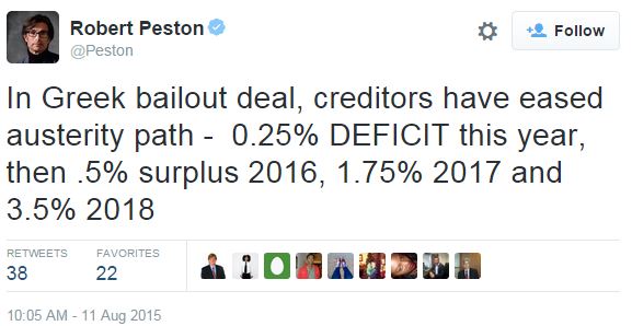 Πρωτογενές έλλειμμα -0,25% του ΑΕΠ το 2015, +0,5% του ΑΕΠ πρωτογενές πλεόνασμα το 2016, +1,75% του ΑΕΠ πρωτογενές πλεόνασμα το 2017 και +3,5% πρωτογενές πλεόνασμα το 2018.