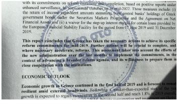 Σύμφωνα με το τελικό κείμενο που περιήλθε σήμερα στην κατοχή του real.gr και του Star “η έκθεση αυτή καταλήγει στο συμπέρασμα ότι η Ελλάδα ανέλαβε τις συγκεκριμένες μεταρρυθμιστικές δράσεις για να ολοκληρώσει τις δεσμεύσεις της για τα μέσα του 2019”.