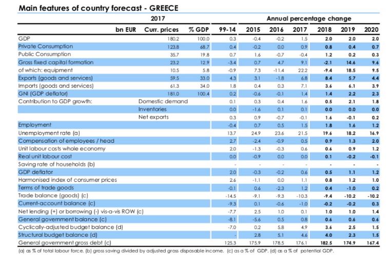 Για το 2018, ο ρυθμός αύξησης του ΑΕΠ αναθεωρήθηκε ελαφρώς σε 2,0%, από 1,9% νωρίτερα, λόγω της βελτίωσης της δυναμικής κατανάλωσης. Οι επενδύσεις αναμένεται να συρρικνωθούν φέτος, καθώς η ανάκαμψη των κατασκευών θεωρείται ανεπαρκής για την εξισορρόπηση της συρρίκνωσης των επενδύσεων εξοπλισμού. Τα μερίδια εξαγωγής της Ελλάδας άρχισαν να αυξάνονται μετά από αρκετά χρόνια πτώσης.