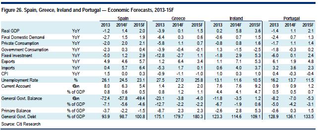 Για την ευρωζώνη, η Citi χαμηλώνει τις προβλέψεις για το 2014 και το 2015 κατά 0,3% και 0,2% στο 0,8% και το 1,5% αντίστοιχα. Πρόκειται για την μεγαλύτερη μείωση στις προβλέψεις της από τον Ιανουάριο του 2012 και για την τρίτη πτωτική αναπροσαρμογή τους τελευταίους τέσσερις μήνες.