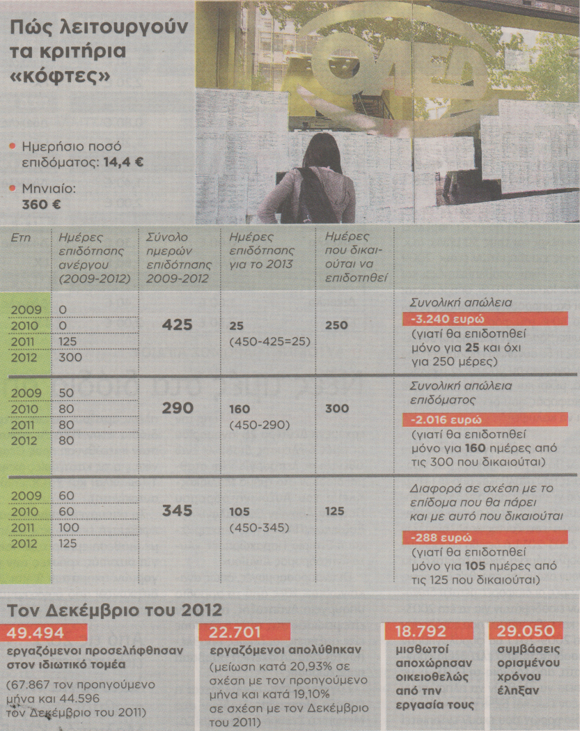 Με το νέο σύστημα επιδότησης ένας άνεργος μπορεί να αποκλειστεί τελείως και να χάσει ως και 4.320 ευρώ ετησίως (συν τα Δώρα) από το επίδομα ανεργίας το 2013. Το 64,24% των εγγεγραμμένων ανέργων είναι πάνω από 30 μέχρι 54 ετών. Κάτω των 30 ετών είναι το 25,56% και άνω των 55 ετών το 10,21%.