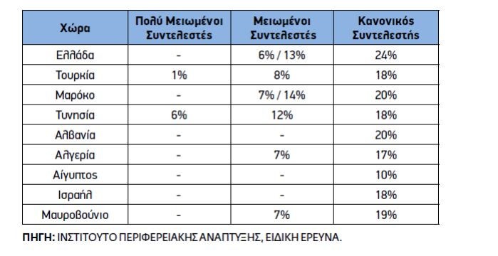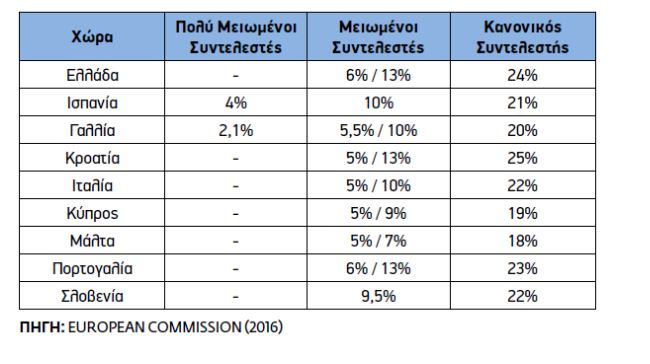 Η Ελλάδα έχει τους υψηλότερους συντελεστές ΦΠΑ από όλες τις τουριστικές ανταγωνίστριες χώρες, με εξαίρεση την Κροατία (24% έναντι 25%), βάσει στοιχείων της Κομισιόν του 2016.