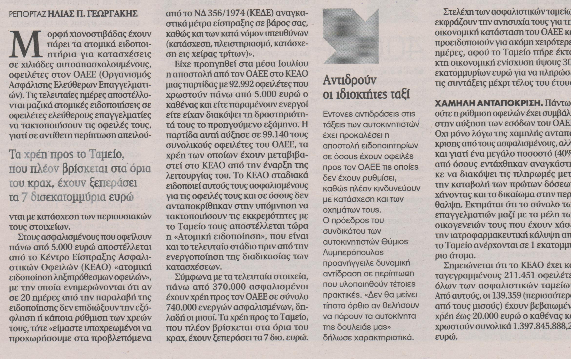 Μορφή χιονοστιβάδας έχουν πάρει τα ατομικά ειδοποιητήρια για κατασχέσεις σε χιλιάδες αυτοαπασχολούμενους, οφειλέτες στον ΟΑΕΕ (Οργανισμός Ασφάλισης Ελεύθερων Επαγγελματιών). Τις τελευταίες ημέρες αποστέλλονται μαζικά ατομικές ειδοποιήσεις σε οφειλέτες ελεύθερους επαγγελματίες να τακτοποιήσουν τις οφειλές τους, γιατί σε αντίθετη περίπτωση απειλούνται με κατάσχεση των περιουσιακών τους στοιχείων.