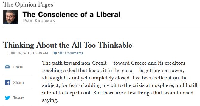 Ο Π. Κρούγκμαν επισημαίνει ότι έχει μείνει σιωπηλός τον τελευταίο καιρό όσον αφορά τις εξελίξεις στην Ελλάδα επειδή δεν θέλει να συμβάλλει και αυτός στην δημιουργία κλίματος πανικού, αλλά νιώθει πως πρέπει να κάνει ορισμένες παρατηρήσεις.