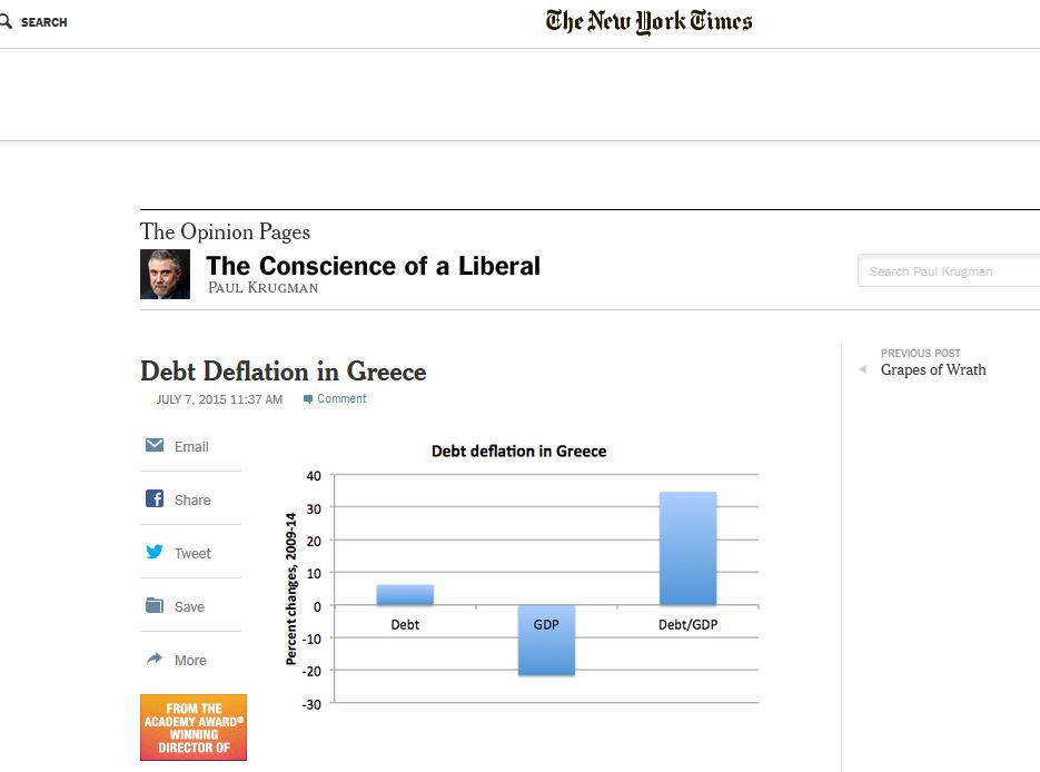 Αυτό σημαίνει ότι το πρόγραμμα της τρόικας ήταν απλά ανέφικτο και θα ήταν ανέφικτο όσο πρόθυμοι κι αν ήταν οι Έλληνες να κάνουν θυσίες. Όσο περισσότερο περικόπτουν, τόσο χειρότερα γίνονται τα πράγματα, εξαιτίας του αποπληθωρισμού του χρέους.