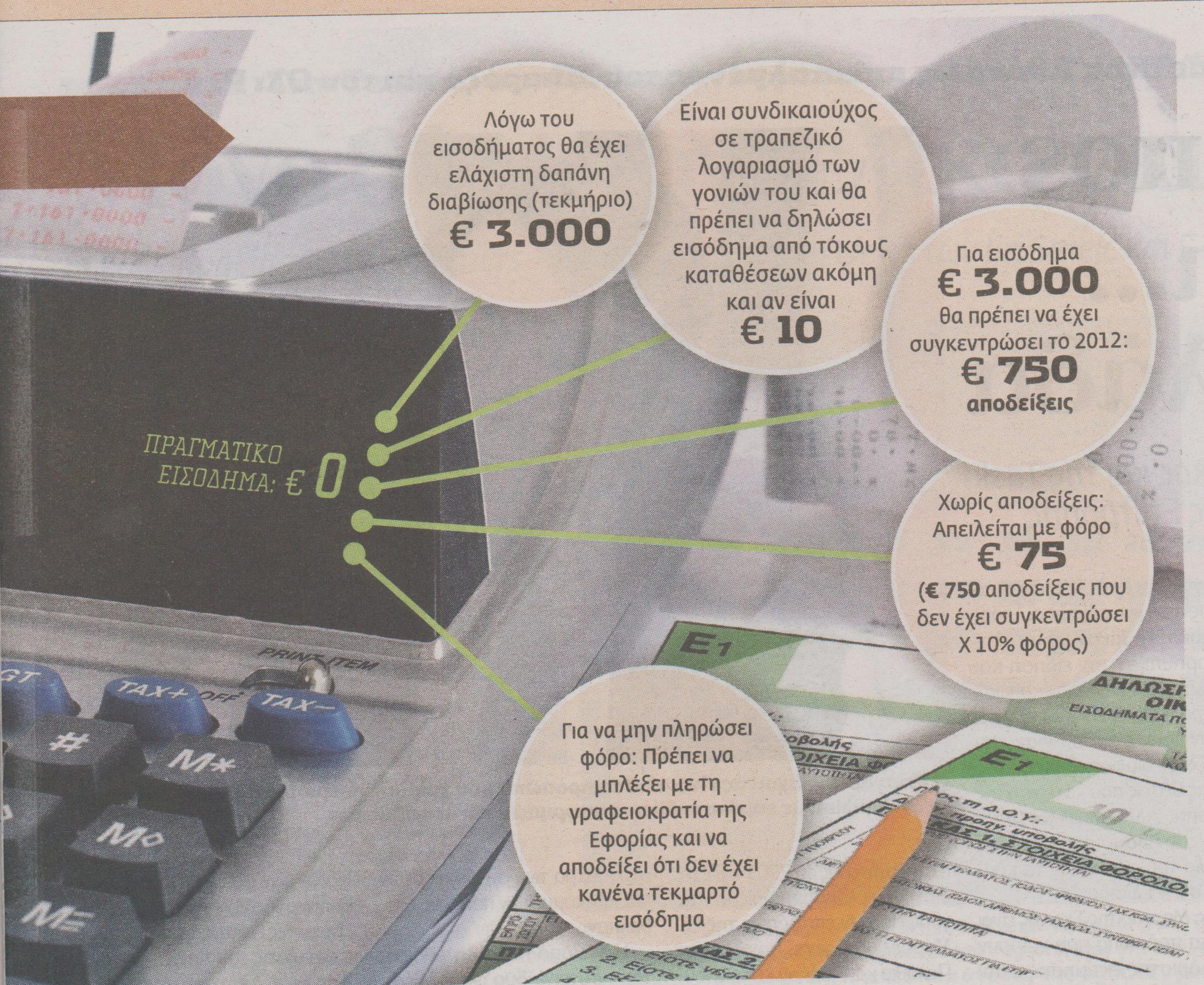 Για πρώτη φορά όλοι οι νέοι άνω των 18 ετών, ακόμη κι αν είναι μαθητές λυκείου, φοιτητές ή φαντάροι, υποχρεούνται ως 30 Ιουνίου 2013 να υποβάλουν φορολογική δήλωση, είτε έχουν εισόδημα είτε όχι.
