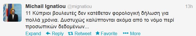 “11 Κύπριοι βουλευτές δεν κατέθεταν φορολογική δήλωση για πολλά χρόνια”, σχολιάζει στο twitter ο δημοσιογράφος Μιχάλης Ιγνατίου.