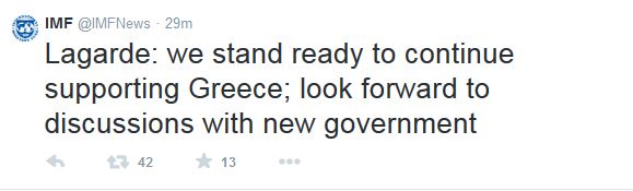 Συγκεκριμένα το tweet του ΔΝΤ με δήλωση της Κριστίν Λαγκάρντ αναφέρει: