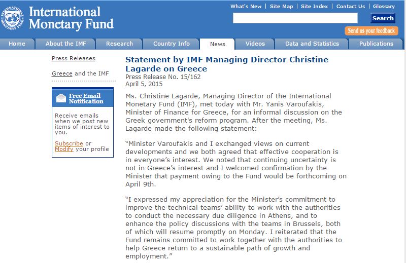Η δήλωση της Κριστίν Λαγκάρντ μετά την συνάντηση επιβεβαιώνει ότι συμφώνησαν με τον Γιάνη Βαρουφάκη πως η δόση των 458 εκατ. ευρώ θα καταβληθεί κανονικά τη Μ. Πέμπτη 9 Απριλίου.