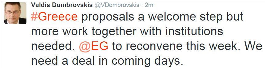 Ο κ. Ντομπρόβσκις έγραψε χαρακτηριστικά: «Οι προτάσεις της Ελλάδας είναι ένα ευπρόσδεκτο βήμα αλλά χρειάζεται περισσότερη δουλειά από κοινού με τα θεσμικά όργανα. Το Eurogroup θα συγκληθεί εκ νέου αυτή την εβδομάδα. Χρειαζόμαστε μάι συμφωνία τις επόμενες μέρες».