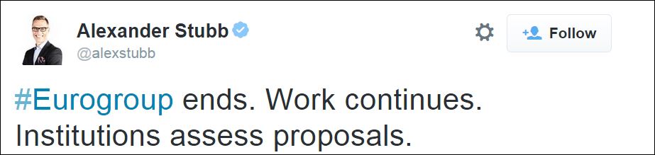 «Το Eurogroup ολοκληρώθηκε. Οι εργασίες συνεχίζονται» έγραψε στο twitter ο Φινλανδός υπουργός Οικονομικών Αλεξάντερ Στουμπ, μετά την ολοκλήρωση της συνεδρίασης.