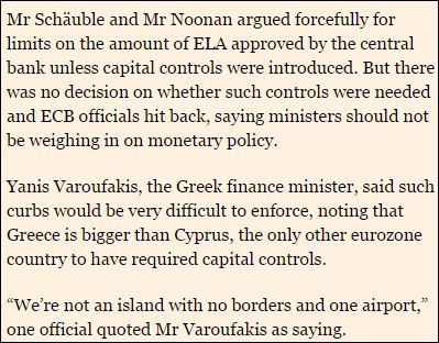 Ο υπουργός Οικονομικών της Γερμανίας κατά τη διάρκεια της συνεδρίασης του Eurogroup, ζήτησε να μπουν περιορισμοί στην χρηματοδότηση μέσω του ELA εκτός και αν επιβληθούν capital controls, δηλαδή έλεγχοι κεφαλαίων στις ελληνικές τράπεζες. Την πρόταση του Σόιμπλε φαίνεται ότι είδε θετικά και ο Ιρλανδός υπουργός Οικονομικών, Μάικλ Νούναν.