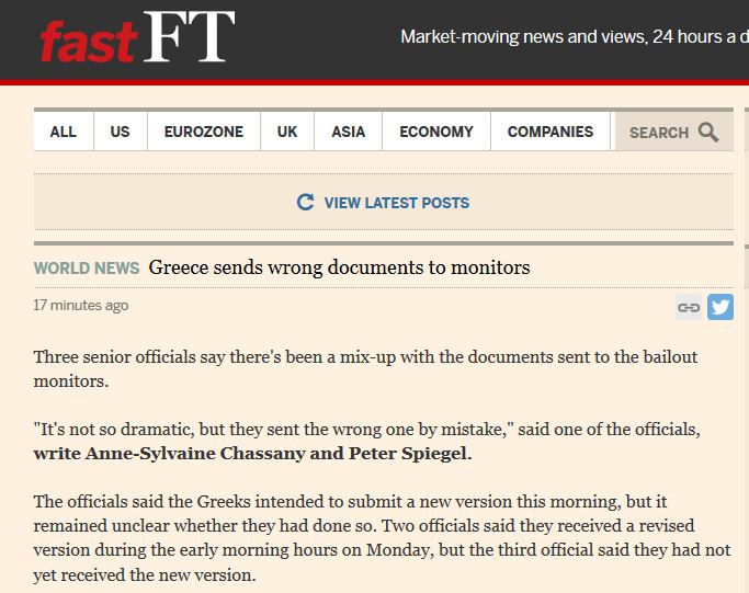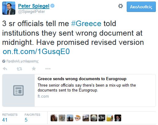 Τρεις ανώτεροι αξιωματούχοι λένε ότι έχει υπάρξει μπέρδεμα με τα έγγραφα που διαβιβάστηκαν το βράδυ από την ελληνική πλευρά και στέλνουν τα διορθωμένα, αναφέρει ο Πίτερ Σπίγκελ των Financial Times με ένα tweet.