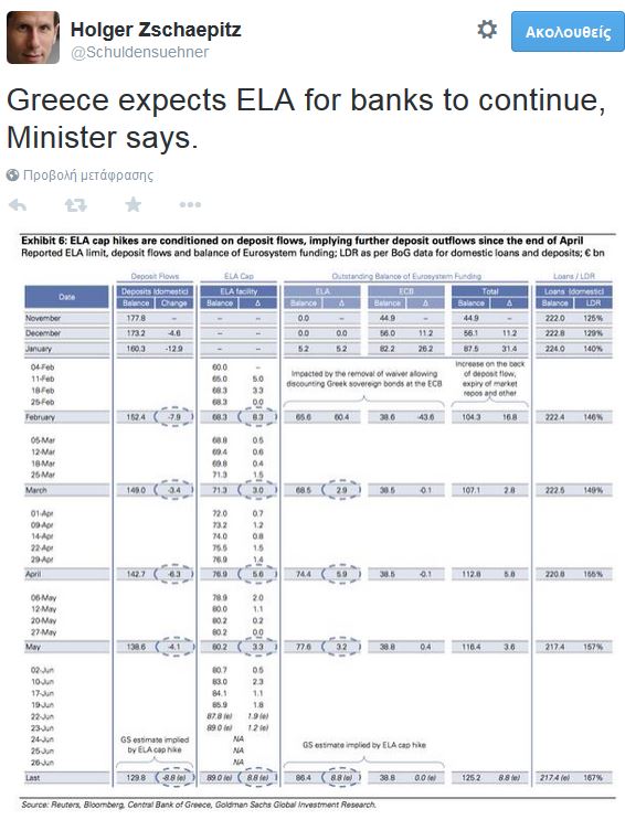 Άλλο tweet λέει για πληροφορίες από την Αθήνα ότι θα υπάρξει συνέχεια της «ένεσης» του ELA, ενώ άλλοι μιλούν για πολιτική απόφαση εάν υπάρξει διακοπή του ELA και αναρρωτιούνται για τις… διαρροές πριν το τέλος της συνεδρίασης του ΔΣ που ξεκίνησε 12 μμ.