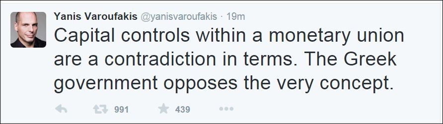 «Οι κεφαλαιακοί έλεγχοι στο πλαίσιο μιας νομισματικής ένωσης είναι μια αντίφαση. Η ελληνική κυβέρνηση αντιτίθεται σε αυτούς τους όρους» έγραψε ο υπουργός Οικονομικών Γιάνης Βαρουφάκης πριν από λίγο στον προσωπικό του λογαριασμό στο twitter.