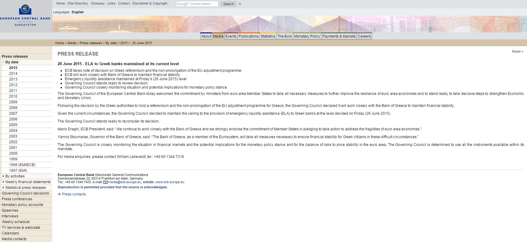 Ο πρόεδρος της ΕΚΤ Μάριο Ντράγκι, δήλωσε: «Συνεχίζουμε να συνεργαζόμαστε στενά με την Τράπεζα της Ελλάδας και υποστηρίζουμε σθεναρά τη δέσμευση των κρατών μελών στην υπόσχεση να αναλάβει δράση για την αντιμετώπιση των αδυναμίες των οικονομιών της ζώνης του ευρώ».
