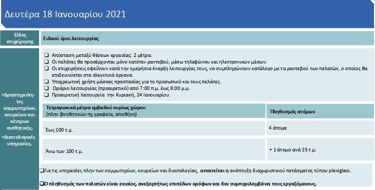 Σημειώνεται πως ανοίγουν και τα εμπορικά κέντρα (malls), ενώ στις “κόκκινες” περιοχές θα λειτουργεί μόνο το click away.