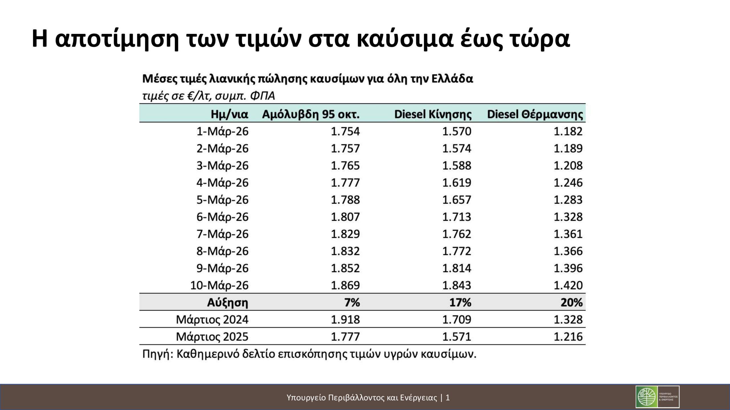 «Ανακοινώνουμε σήμερα προληπτικές παρεμβάσεις στην αγορά υγρών καυσίμων, αποτρέποντας αθέμιτης κερδοφορίας σε βάρος πολιτών. Από την έναρξη ισχύος της ΠΝΠ έως τις 30 Ιουνίου, θεσπίζεται πλαφόν στο περιθώριο κέρδους στα καύσιμα. Οι εταιρείες εμπορίας πετρελαιοειδών που προμηθεύουν τα πρατήρια λιανικής απαγορεύεται να επιβάλλουν στην τιμή της αμόλυβδης βενζίνης 95 οκτανίων και του πετρελαίου κίνησης diesel ποσό μεγαλύτερο των 5 λεπτών ανά λίτρο σε σχέση με την τιμή προμήθειας από τα διυλιστήρια.