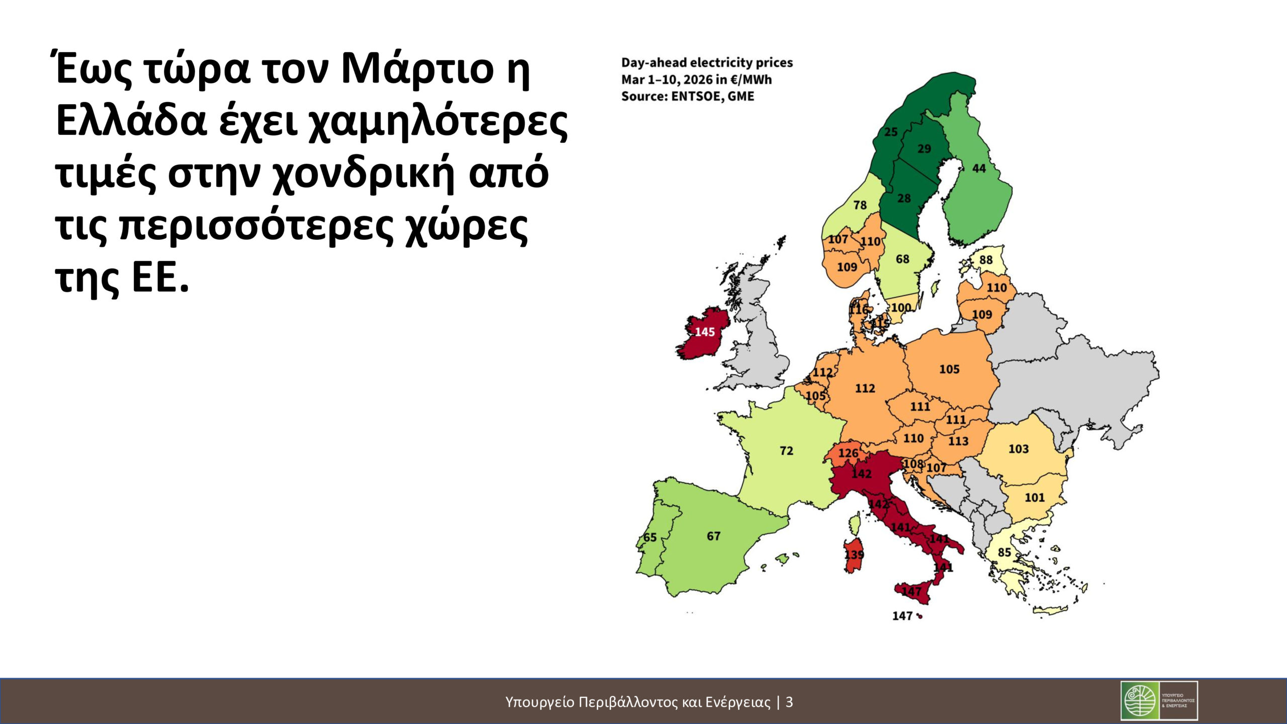 Την ίδια στιγμή, όπως είπε, αποδεικνύεται η ανθεκτικότητα, που έχει η χώρα μας, η ενεργειακή. «Χθες η χώρα μας ήταν η 4η φτηνότερη χώρα στην Ευρώπη στην χονδρική τιμή ηλεκτρικής ενέργειας. Να σημειώσω ότι τον Ιανουάριο η μέση χοντρική τιμή ήταν στα 109 ευρώ/MW, τον Φεβρουάριο ήταν στα 78 ευρώ και τον Μάρτιο ως χθες είναι στα 86 ευρώ/MW. Γιατί όμως γίνεται αυτό, ενώ η διεθνής κρίση πιέζει το ενεργειακό κόστος; Γιατί έχουμε άμυνες που ενισχύουν την ανθεκτικότητά μας στις διακυμάνσεις αυτές. Έχουμε ένα διαφοροποιημένο ενεργειακό μείγμα με ισχυρή ανάπτυξη των ανανεώσιμων πηγών ενέργειας. Και αυτό αποδεικνύεται κρίσιμο την περίοδο αυτή με τη σημαντική ανατίμηση της τιμής του φυσικού αερίου. Σήμερα οι ανανεώσιμες πηγές ενέργειας καλύπτουν πάνω από το 50% της ηλεκτροπαραγωγής της χώρας. Ενώ μόνο τους τελευταίους 12 μήνες έχουν προστεθεί επιπλέον 2,8GW νέας ισχύος από τις ΑΠΕ. Παράλληλα, προχωρούμε με γρήγορους ρυθμούς μέσα στο χρόνο στην εγκατάσταση συστημάτων αποθήκευσης ενέργειας με μπαταρίες, που θα επιτρέψουν την ακόμα καλύτερη αξιοποίηση της πράσινης παραγωγής των ανανεώσιμων πηγών και θα βοηθήσουν στη σταθερότητα του συστήματος. Επιπλέον, οι φετινές αυξημένες βροχοπτώσεις έχουν ενισχύσει σημαντικά τα υδροηλεκτρικά αποθέματα της χώρας. Άλλη μία άμυνα στην αύξηση της τιμής, προσφέροντας περίπου 1 TW παραγωγής ηλεκτρικής ενέργειας.