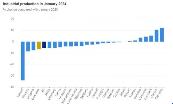 Σε ετήσια βάση η βιομηχανική παραγωγή μειώθηκε κατά 6,7% στην Ευρωζώνη και κατά 5,7% στην ΕΕ. Η Ελλάδα και σε αυτό τον δείκτη βρίσκεται μεταξύ των τριών χωρών με τη μεγαλύτερη ετήσια ανάπτυξη της βιομηχανικής παραγωγής. Στο σχετικό πίνακα πρώτη είναι η Σλοβενία με αύξηση 12,2%, δεύτερη η Ελλάδα με αύξηση 10,5% και τρίτη η Δανία με αύξηση 5,5%.