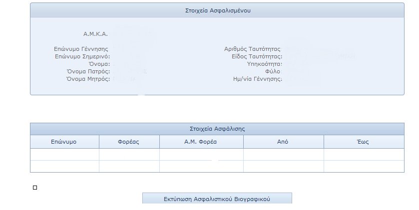 Στην παρακάτω οθόνη που εμφανίζεται οι ασφαλισμένοι μπορούν να δουν τα ένσημα τους συγκεντρωτικά ανά ταμείο ενώ πατώντας την επιλογή εκτύπωση του ασφαλιστικού βιογραφικού μπορούν να δουν αναλυτικά όλα τα ένσημα μηνιαίως.