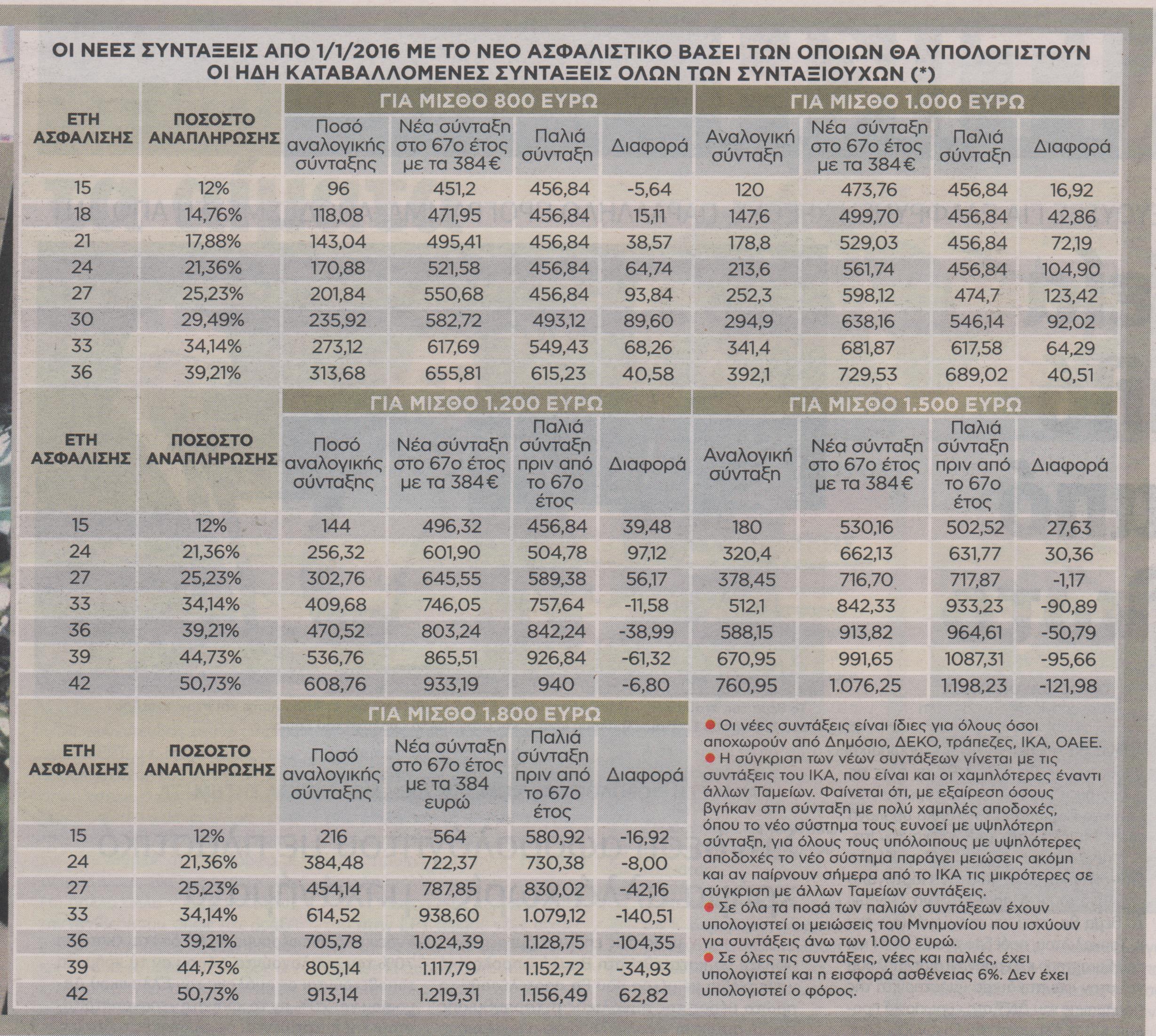 -Ασφαλισμένος με 27 χρόνια και μισθό 1.800 ευρώ θα πάρει -από όποιο Ταμείο και αν αποχωρήσει- 787,85 ευρώ, ενώ θα έπαιρνε (ενδεικτικά από το ΙΚΑ) 830 ευρώ. Με 33 χρόνια, θα πάρει 938,60 ευρώ ενώ θα έπαιρνε 1.079,12 ευρώ και με 36 χρόνια θα πάρει 1.024,39 ευρώ ενώ θα έπαιρνε 1.128,75 ευρώ.