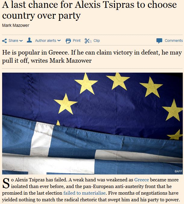 Παρά τις διαφορές ΔΝΤ και Κομισιόν, η τακτική του Α. Τσίπρα ένωσε τους συνομιλητές του, σχολιάζει ο ιστορικός Μαρκ Μαζάουερ στους Financial Times. Τους ένωσε στην απόφαση να οδηγήσουν την Ελλάδα στον ίδιο καταστροφικό δρόμο, όπως πριν, εξηγεί.
