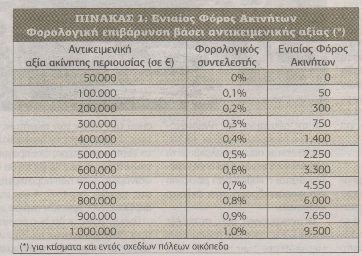 3. Το υπόλοιπο της φορολογητέας αντικειμενικής αξίας που θα απομένει, μετά την αφαίρεση του αφορολογήτου των 50.000 ευρώ, θα φορολογείται με κλίμακα συντελεστών που θα κυμαίνονται από 0,1% έως και 1,5%, χωρίς να αποκλείεται καιη εφαρμογή ανώτατου συντελεστή 2% για πολύ μεγάλης αξίας περιουσίες.