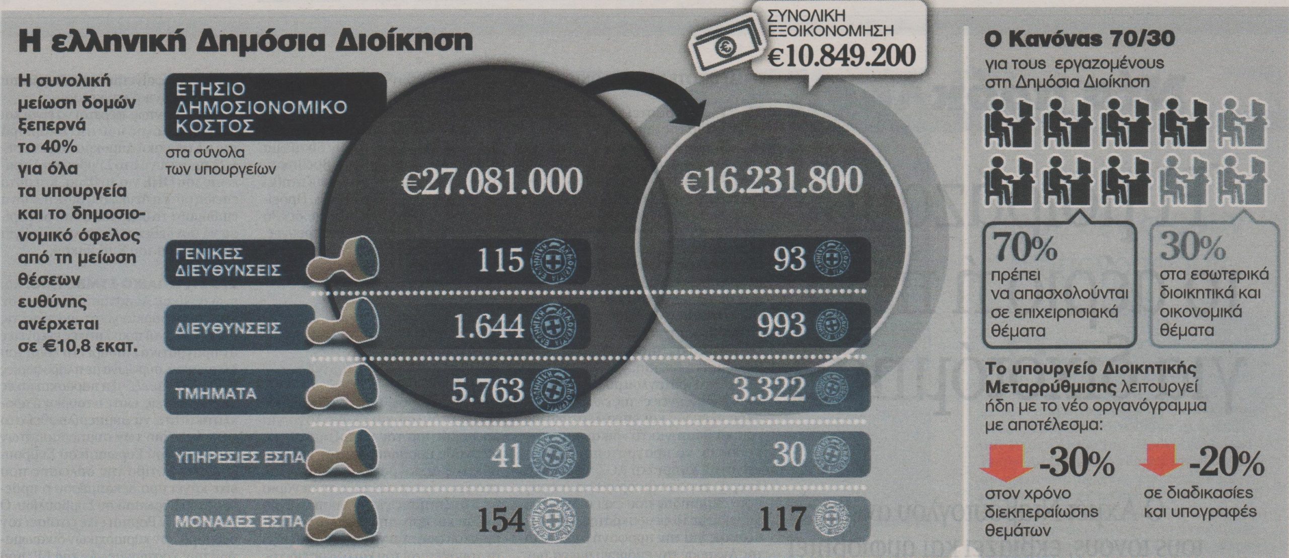 Σύμφωνα με το σχέδιο του υπουργού Διοικητικής Μεταρρύθμισης, Κυριάκου Μητσοτάκη, η μείωση δομών και προϊσταμένων θα επιφέρει και σημαντική εξοικονόμηση πόρων τόσο από τον περιορισμό δαπανών για τη λειτουργία των επιμέρους υπηρεσιών όσο και το ψαλίδι στα επιδόματα θέσης ευθύνης τα οποία λάμβαναν οι χιλιάδες επικεφαλής αυτών.