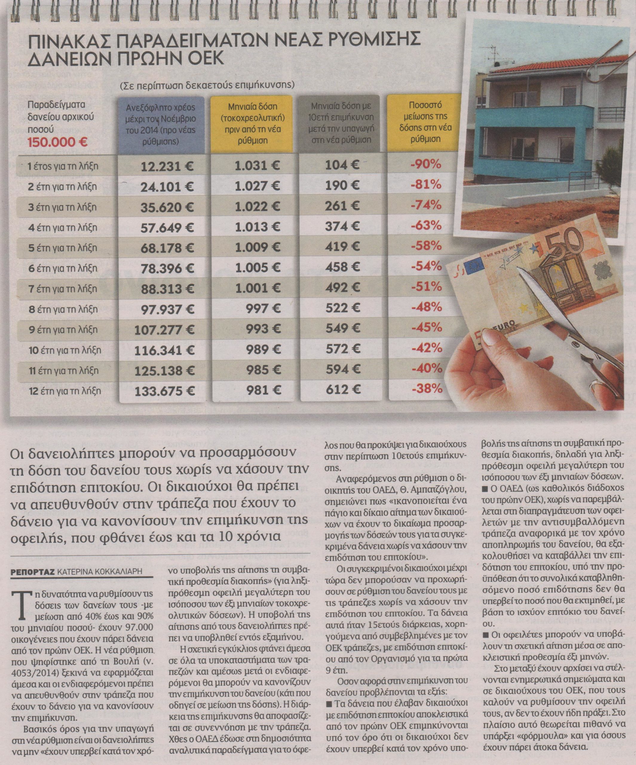 Τη δυνατότητα να ρυθμίσουν τις δόσεις των δανείων τους –με μείωση από 40% έως και 90% του μηνιαίου ποσού- έχουν 97.000 οικογένειες που έχουν πάρει δάνεια από τον πρώην ΟΕΚ. Η νέα ρύθμιση που ψηφίστηκε από τη Βουλή (ν. 4053/2014) ξεκινά να εφαρμόζεται άμεσα και οι ενδιαφερόμενοι πρέπει να απευθυνθούν στην τράπεζα που έχουν το δάνειο για να κανονίσουν την επιμήκυνση.
