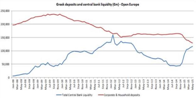 Το γράφημα του Open Europe δείχνει τη διαχρονική εξέλιξη των καταθέσεων και της εξάρτησης των τραπεζών από την ρευστότητα του ευρωσυστήματος. Η Ελλάδα βρίσκεται ξανά στο σημείο μηδέν, πίσω στο 2012 με το «κούρεμα», την ελεγχόμενη χρεοκοπία.