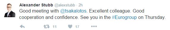 “Ήταν καλή η συνάντηση με τον κ. Τσακαλώτο. Είναι εξαιρετικός συνάδελφος. Καλή συνεργασία και εμπιστοσύνη. Τα λέμε στο Eurogroupg την Πέμπτη” έγραψε ο κ. Στουμπ.