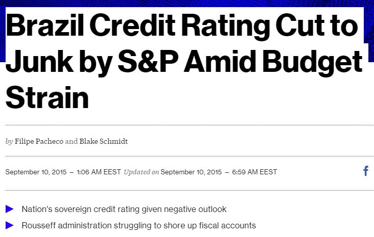 Η υποβάθμιση από την S&P σε «σκουπίδι» αποτελεί ισχυρό πλήγμα για την κυβέρνηση της προέδρου Ντίλμα Ρούσεφ. Η βαθμολόγηση της πιστοληπτικής ικανότητας της μεγαλύτερης οικονομίας στης Λατινική Αμερική μειώθηκε σε BB+ από BBB- και μάλιστα με αρνητική προοπτική, που σημαίνει πως υπάρχει κίνδυνος νέας υποβάθμισης μέσα στους επόμενους μήνες.