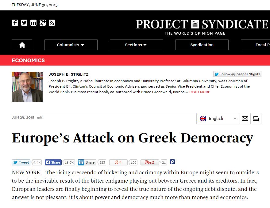 Μετά την υποστήριξη του «όχι» από τον Πολ Κρούγκμαν στο ελληνικό δημοψήφισμα σειρά έχει με άρθρο του και ο Τζόζεφ Στίγκλιτς να συμφωνήσει με το «όχι».