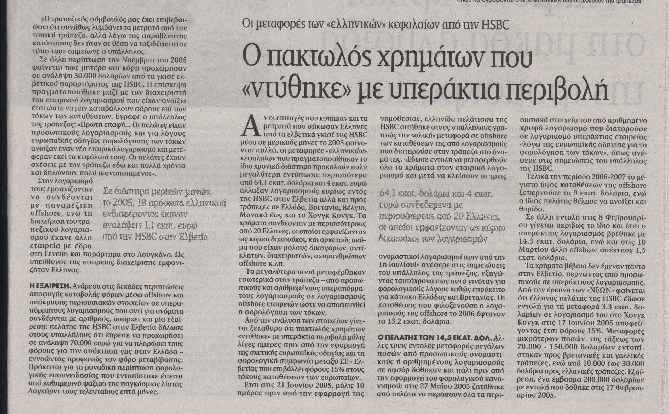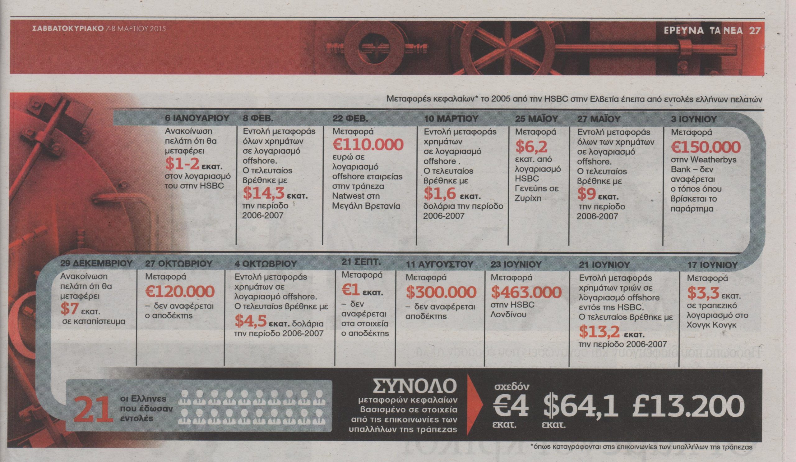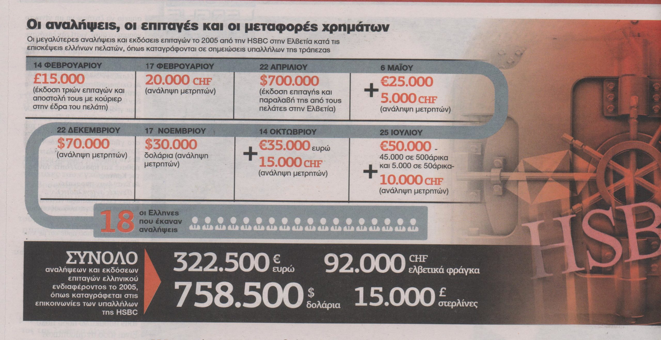 Μέσα σε διάστημα μερικών μηνών το 2005, από καταστήματα υποκαταστήματος τράπεζας στην Ελβετία πραγματοποιήθηκαν από 18 πρόσωπα ελληνικού ενδιαφέροντος αναλήψεις που ξεπερνούσαν το 1,1 εκατ. ευρώ. Κάποιοι απ’ αυτούς τα πήραν σε ευρώ, άλλοι σε δολάρια, άλλοι σε ελβετικά φράγκα και σε επιταγές σε στερλίνες. Υπήρξαν ακόμα και προτιμήσεις όσον αφορά τον αριθμό των χαρτονομισμάτων που θα κουβαλούσαν μαζί τους από το ταμείο.