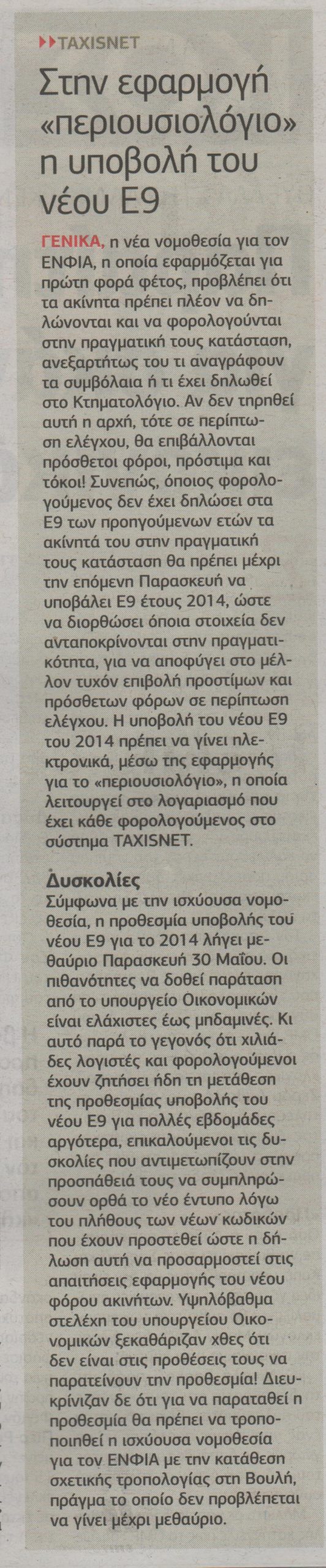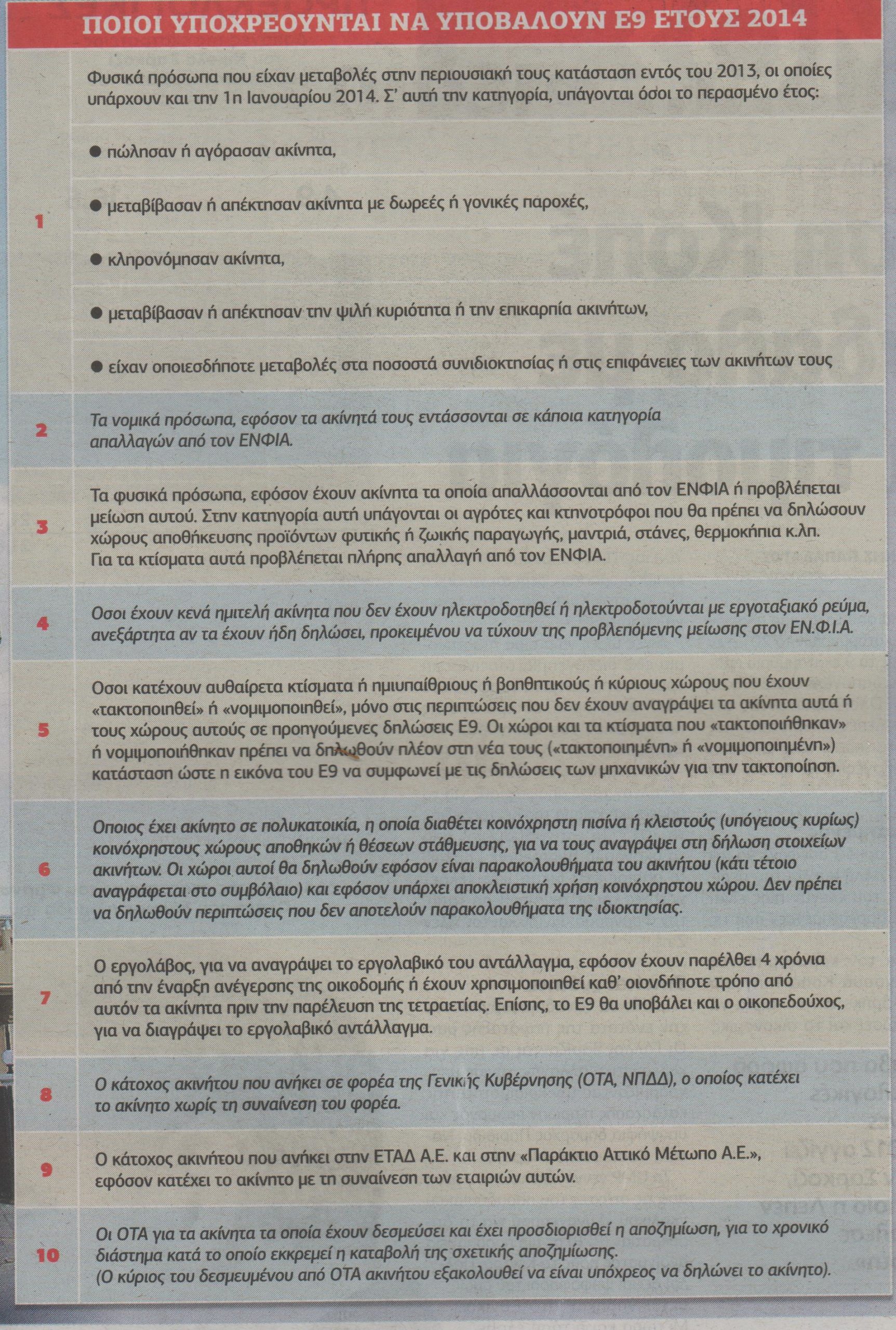 Πάνω από 1,5 εκατομμύριο ιδιοκτήτες ακινήτων θα πρέπει να έχουν συμπληρώσει και να έχουν υποβάλει ηλεκτρονικά το νέο πολύπλοκο έντυπο Ε9 είτε για να παράσχουν στις υπηρεσίες του υπουργείου Οικονομικών χρήσιμες πληροφορίες αναγκαίες για τον ορθό υπολογισμό του νέου Ενιαίου Φόρου Ιδιοκτησίας Ακινήτων (ΕΝΦΙΑ) είτε για να δηλώσουν αλλαγές στην ακίνητη περιουσία τους, οι οποίες έλαβαν χώρα κατά τη διάρκεια του 2013.