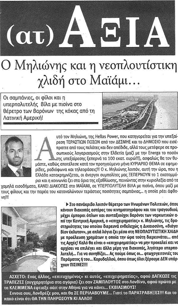 Κατηγορείται για την υπεξαίρεση τεράστιων ποσών από τον ΔΕΣΜΗΕ και το δημόσιο αλλά συνεχίζει αμέριμνος τις διακοπές του στο Μαιάμι, σύμφωνα με το ρεπορτάζ της εφημερίδας ΑΞΙΑ.Ο λόγος, όπως γράφει η εφημερίδα “Αξία”, για τον Bασίλη Μηλιώνη της Hellas Power, ο οποίος αυτή τη στιγμή ζει μέσα στη χλιδή, σε υπερπολυτελή βίλα της αμερικάνικης μεγαλούπολης.Διαβάστε το ρεπορτάζ της εφημερίδας: