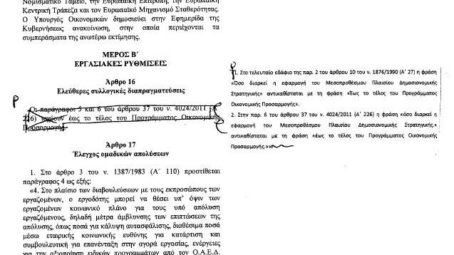 Και το αγγλικό κείμενο: «Labour market: Collective bargaining Adopt legislation (prior action) in order to provide that the 2011 collective bargaining reforms will remain in force until the end of the ESM programme. This includes the suspensions of favourability principle and the extension principle».