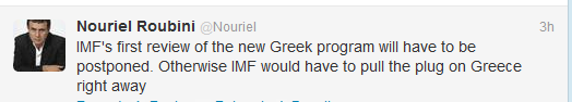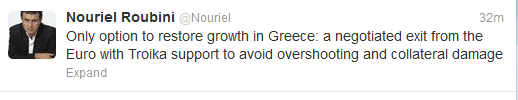 “Η μόνη επιλογή για την αποκατάσταση της ανάπτυξης στην Ελλάδα είναι η εξόδος από το ευρώ με διαπραγμάτευση και την υποστήριξη της Τρόικας, προκειμένου να αποφευχθούν οι υπερβολικές και παράπλευρες απώλειες”, έγραψε πριν από λίγο στο Twitter ο Νομπελίστας οικονομολόγος Νουριέλ Ρουμπινί.Προηγουμένως είχε γράψει και πάλι στο Twitter, ότι “πρέπει να αναβληθεί η πρώτη επανεξέταση του νέου ελληνικού προγράμματος”. Σε διαφορετική περίπτωση, αναφέρει, “το ΔΝΤ θα πρέπει να τραβήξει την πρίζα από την Ελλάδα αμέσως”.