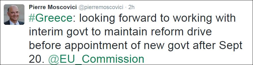 «Ανυπομονούμε να συνεργαστούμε με την υπηρεσιακή κυβέρνηση για να διατηρήσουμε τη μεταρρυθμιστική πορεία, πριν από τον διορισμό της νέας κυβέρνησης, μετά από τις 20 Σεπτεμβρίου» έγραψε ο κ. Μοσκοβισί.
